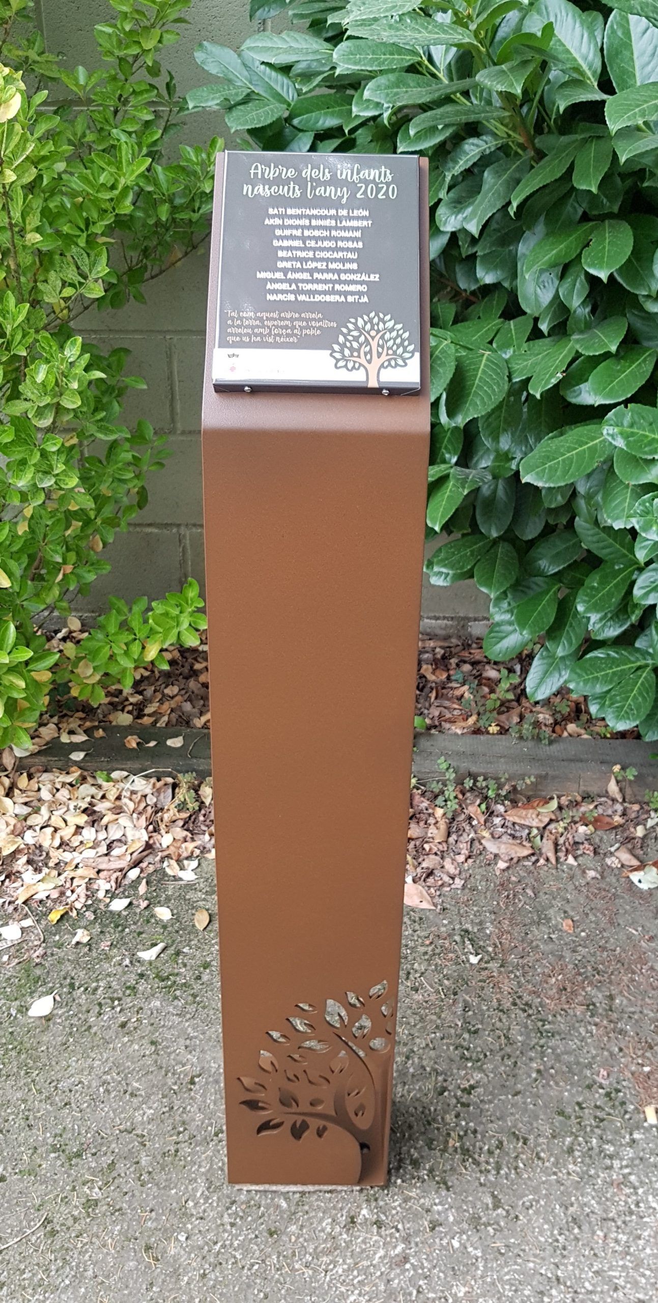 Descripción: Atril de plancha de acero con pletina para collar al suelo, pintado simulación óxido y placa de 180×240 mm. Parte inferior de la columna dibujo agujereado con láser.