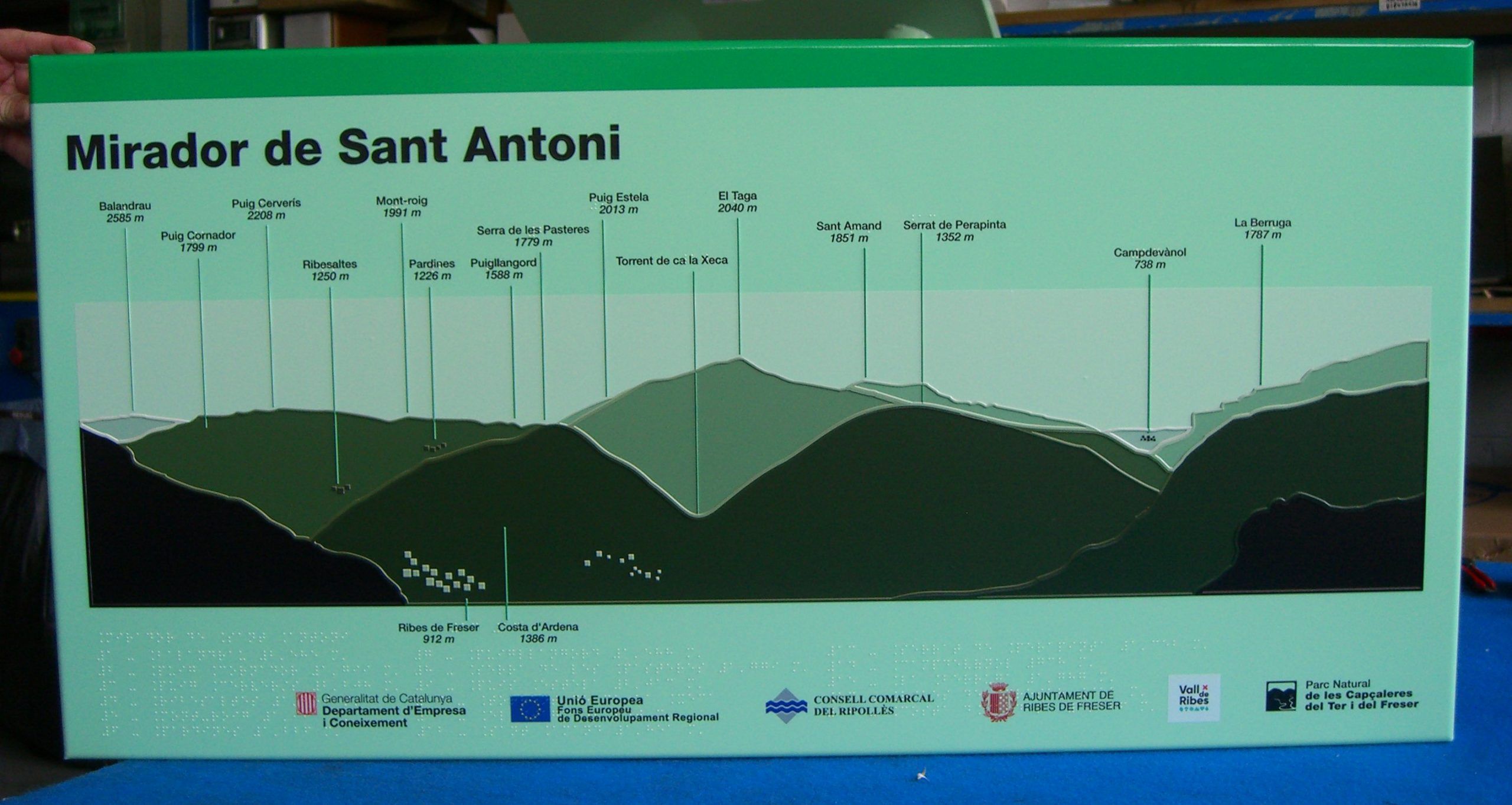 Descripción: Atril panorámico formado por módulo de 900x450mm de aluminio con relieve de montañas y Braille