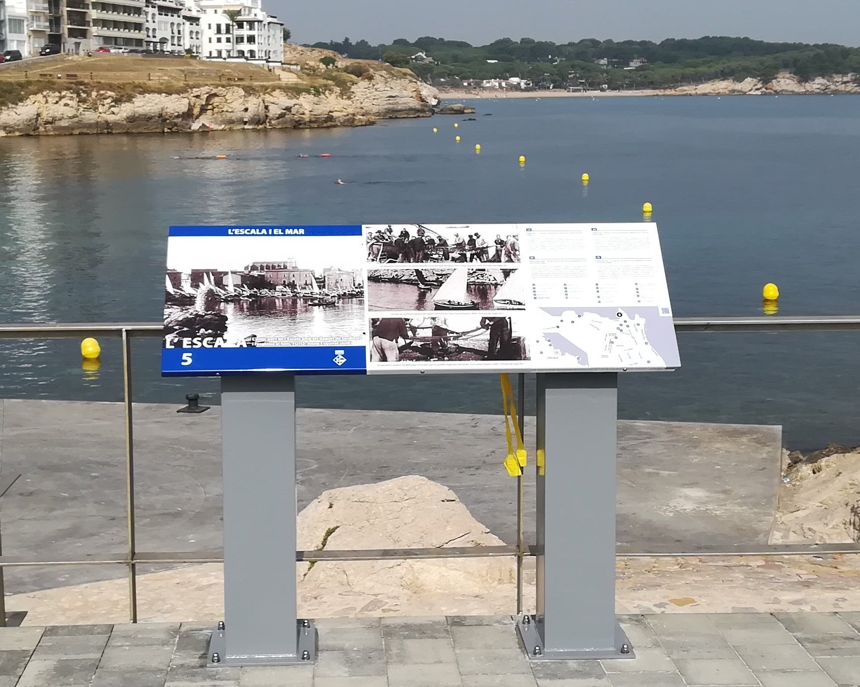 Descripción: Atril formado por módulo de 1200x500x25 mm. en acero inoxidable A316L pintado y rotulado con impresión digital laminada, soporte doble