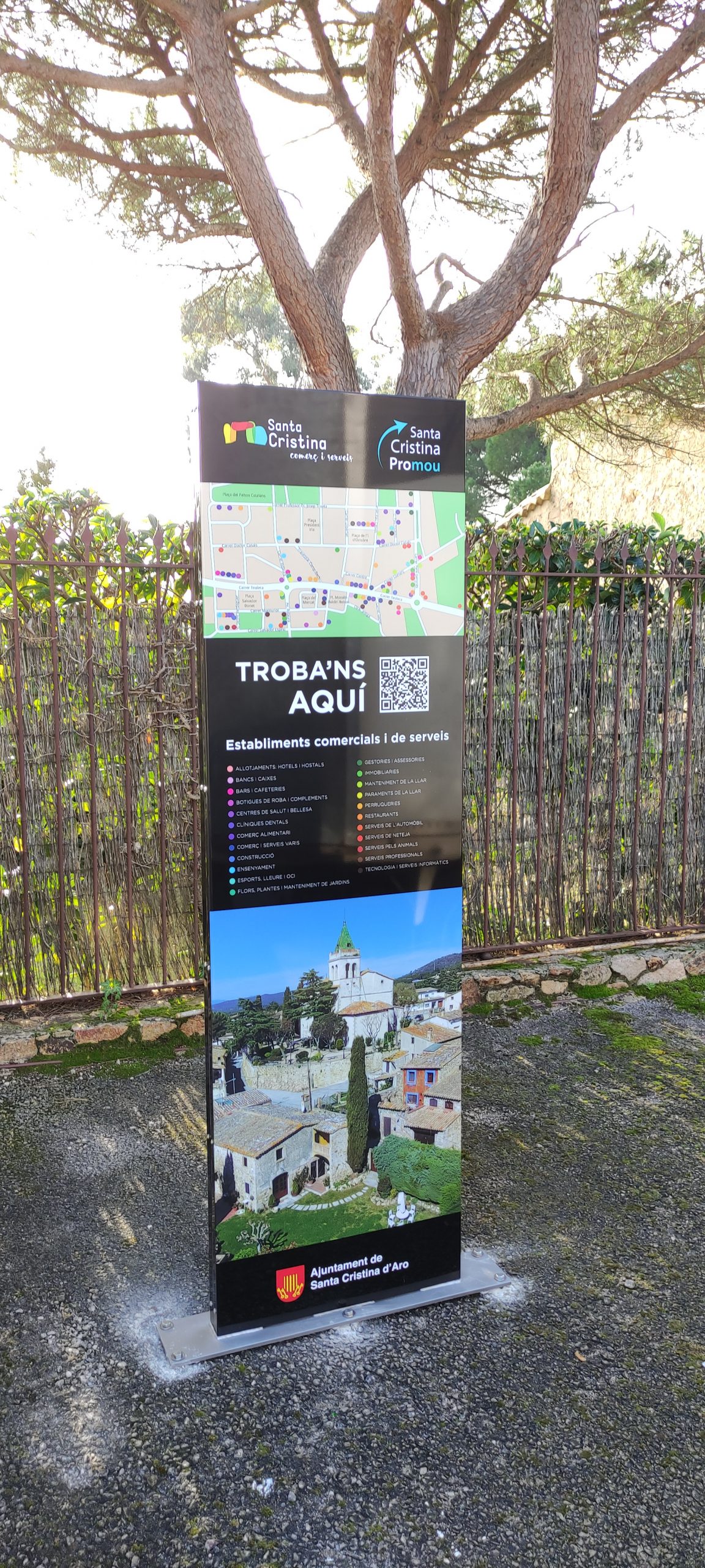 Descripción: Tótem de 585×1971,5x63mm con estructura interna de tubo galvanizado de 60, dos bandejas de aluminio rotuladas con impresión digital laminada y pletina inoxidable para apretar en el suelo