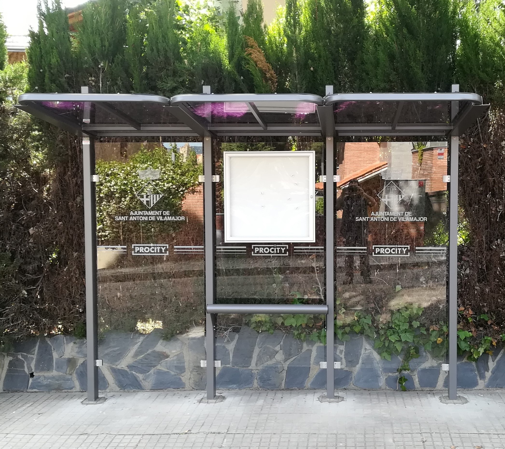 Descripció: Marquesina convinable que permet fer extensions per mòduls, inclou vitrina d’informació acabat amb pintura sobre galvanitzat