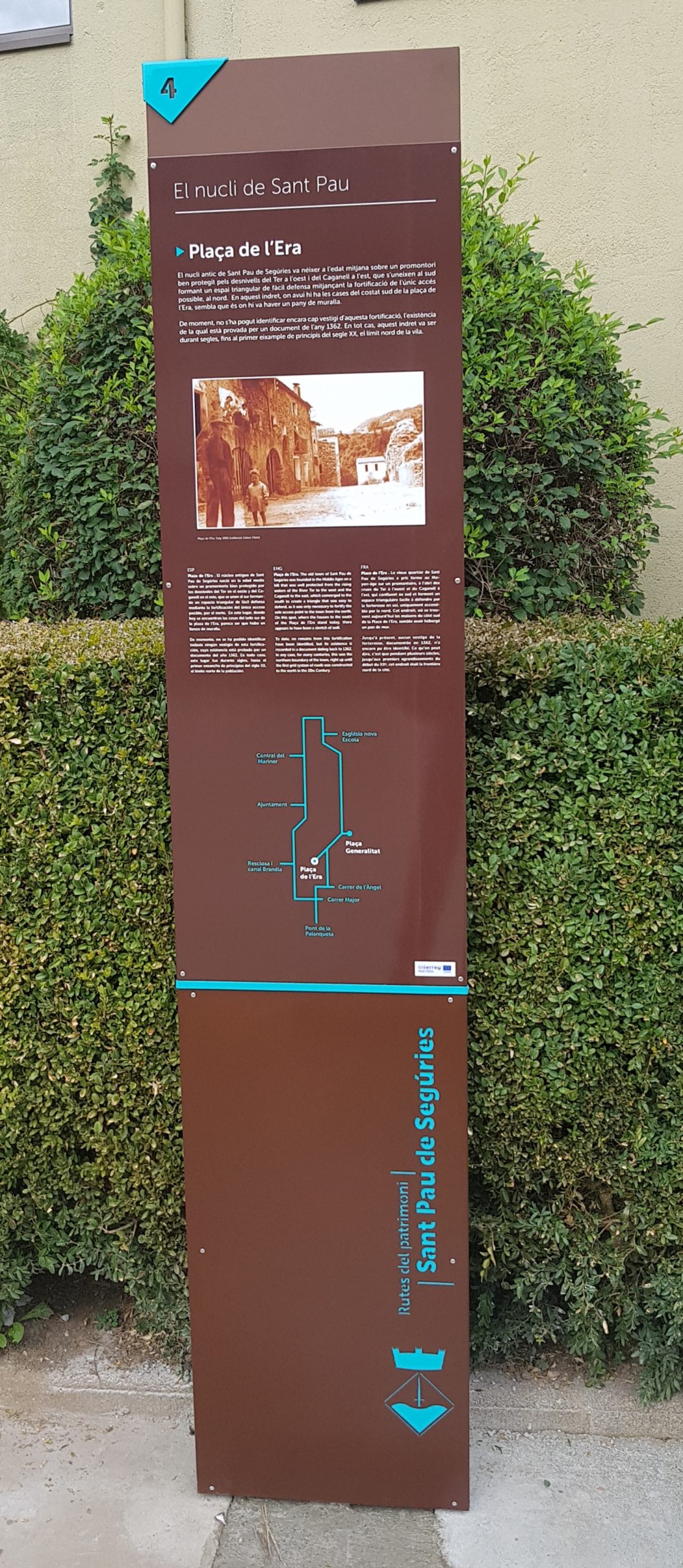 Descripció: Tòtem de d’acer corten i acer galvanitzat en calent de 400x2000x8mm amb planxa retolada, escut i lletres inferiors amb làser i fons de color